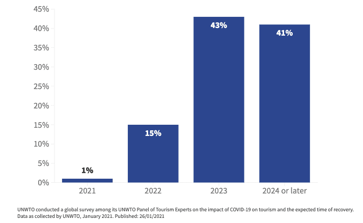 进一步展望未来,大多数专家不看到回到电视台的水平在2023年之前发生。事实上,43%的受访者指出,2023年,41%的人预计回到2019年的水平只会发生在2024年或以后。UNWTO 2021 - 2024年的扩展场景表明它可能两到四年半国际旅游回到2019年的水平。
