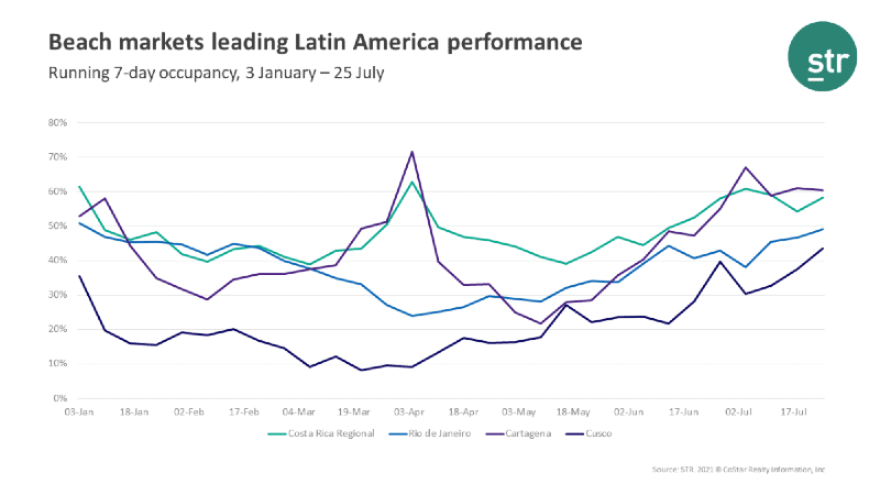 随着需求仍然主要是国内leisure-driven市场依赖领域是领先的酒店在该地区的表现。半岛手机端下载19-25 7月期间,卡塔赫纳发布该地区最高的入住率为60.4%。每周市场的入住率高达2021年的71.6%(4月4周结束)。在其他STR-defined市场,哥斯达黎加的区域排在第二位在7月25日当周,为58.2%,里约热内卢经历了49.1%的入住率水平,最低的在这群海滩目的地。