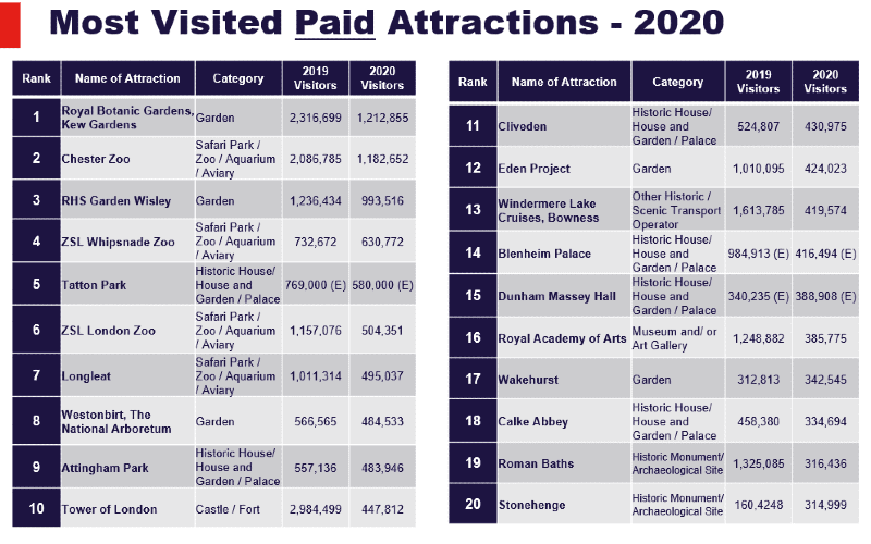 这项调查收集了1301个英国景点的信息,还显示了2020年国际游客减少的影响,海外游客数量下降了93%。