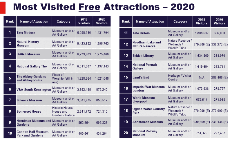 在英国免费景点排行榜上,排名第一的是泰特现代美术馆(Tate Modern),游客140万人次,较2019年下降77%;其次是自然历史博物馆(Natural History Museum),游客130万人次,下降76%;大英博物馆(British Museum)游客128万人次,下降80%。