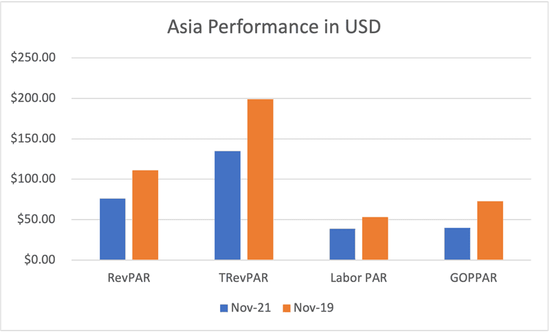 数字11月亚洲仍然摇摆不定。中国是一个奇怪的情况:这是一个地区2020年后端数字超过2021。8月业绩暴跌后由于爆发,难以恢复。ADR仍高于2019年的水平,但入住率仍低于50%,导致平均41美元,这是2020年同时低于28%。总收入同比下降了25%。
