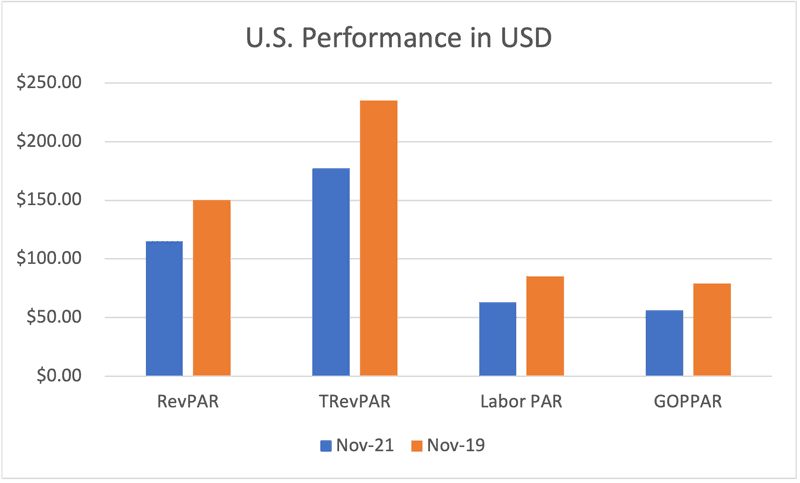 11月数据显示不均匀。尽管流行继续影响旅游,大部分的美国月的季节性趋势。典型的10月份利润激增,通常让位于11月下降。每间可用客房平均营业利润总额的55.68美元,这是一个大的上升在一年前同期,当GOPPAR仍处于负值。,它仍然是对2019年11月下降了29.4%。