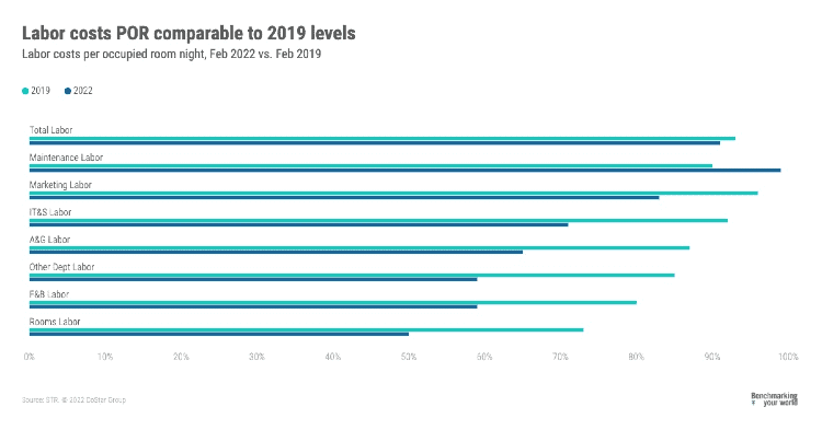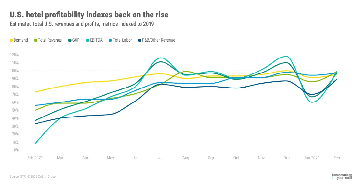 STR财务业绩主管拉奎尔·奥尔蒂斯(Raquel Ortiz)表示:“随着营收表现的趋势,欧米克隆在美国的盈利水平比之前的版本恢复得更快。”2月份的GOPPAR约为2019年同期的77%,但独立连锁店(108%)、豪华连锁店(94%)和中型连锁店(88%)远高于全国平均水平。高收入人群(67%)和高收入人群(70%)持续赤字最大。