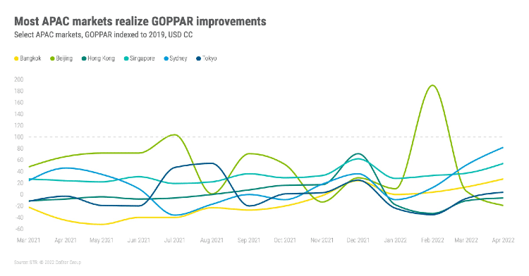 也较前月报告重大改进,新加坡公布4月GOPPAR 45.56美元。这一水平的54%大流行前可比市场已经达到后3月只有37%使用相同的比较。曼谷GOPPAR 27%的2019相比,高于3月份的13%。