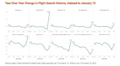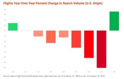 看美国的起源我们看到大幅增加在飞行中搜索在过去一周半。航空公司领导这大大降低价格和增加灵活的票政策在3月的第一个星期宣布。鼓励旅游者与无风险的门票。未来的威胁取消和变更费用使得搜索航班在美国和国际。