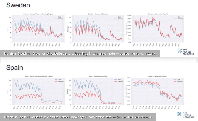 看着直接使用酒店网络预订趋势数据集(参见我们的全部细节bd手机版网页有限责任公司半岛手机端下载COVID在酒店资源页面),我们可以看到,3月份酒店坐落在瑞典没有经验的突然大幅下降预订引擎流量和直半岛手机端下载bd手机版网页有限责任公司接预订,被认为在西班牙。尽管有明显下降,曲线更加渐进的预定量是主要由国内游客的支持,最有可能因为他们的高流动性。转化率在瑞典也显示出复苏的迹象在四月的第一天,帮助提高预定量。