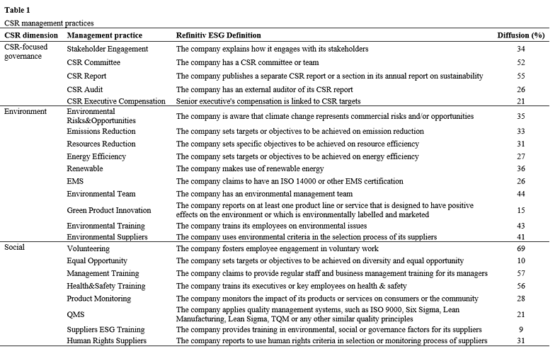 如表1中显示。,five practices reflect how CSR issues are integrated at the governance level, 10 focus on the environmental dimension (such as GHG emissions, air quality, energy management, and waste management); and the remaining eight focus on the social dimension (such as product quality and safety, customer welfare, labor practices and employee health and safety).