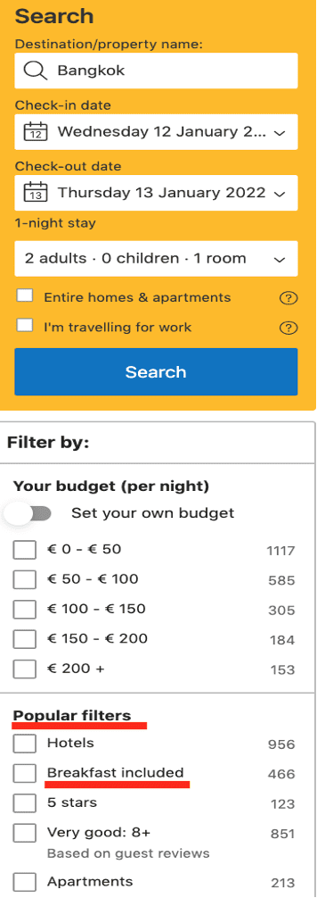 下面的图显示了客人如何使用“早餐包括“在线旅行社作为主要搜索过滤器。