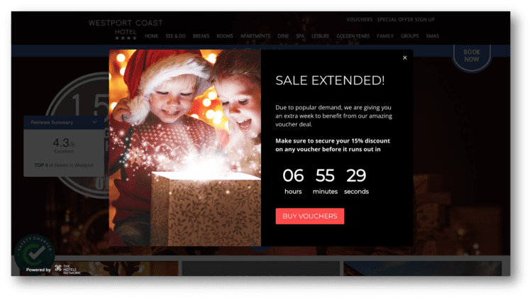 在这些学习中反复出现的一个主要主题是紧迫性。开始设计黑色星期五活动的紧迫性,让活动现场直播,面向客人,制作你的信息和CTA,鼓励人们在你的酒店快速预订。为了传达你的活动的时间敏感性质,在一个倒计时钟层在你的网站上向潜在的未来客人展示黑色星期五的优惠。事实证明,这种方法对提高转化率非常有效,因为它有助于推动访问者朝着正确的方向完成他们的预订,而不是拖延和冒错过优惠的风险。